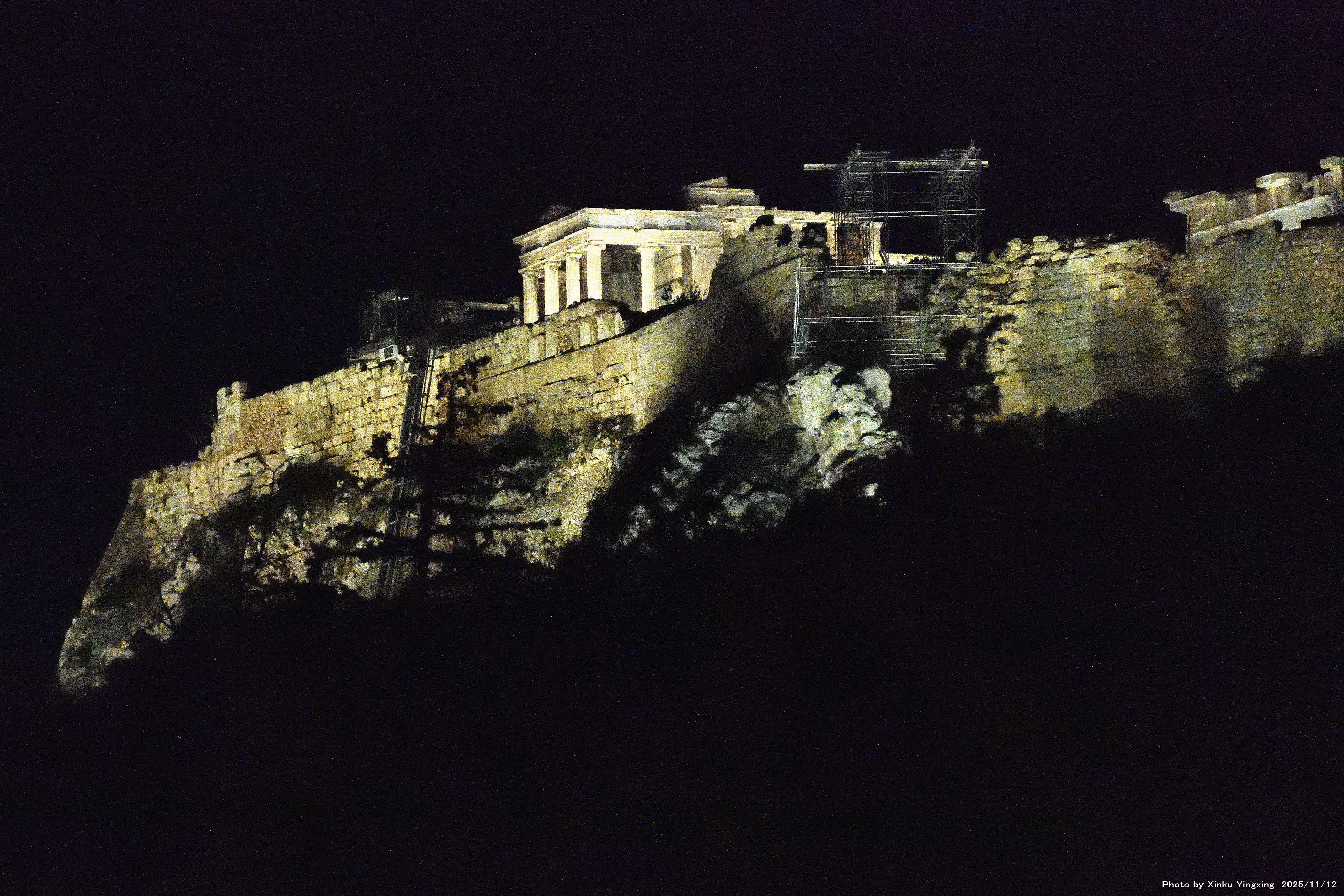 7-3 アクロポリスの丘、プロピュライアのライトアップを望む |