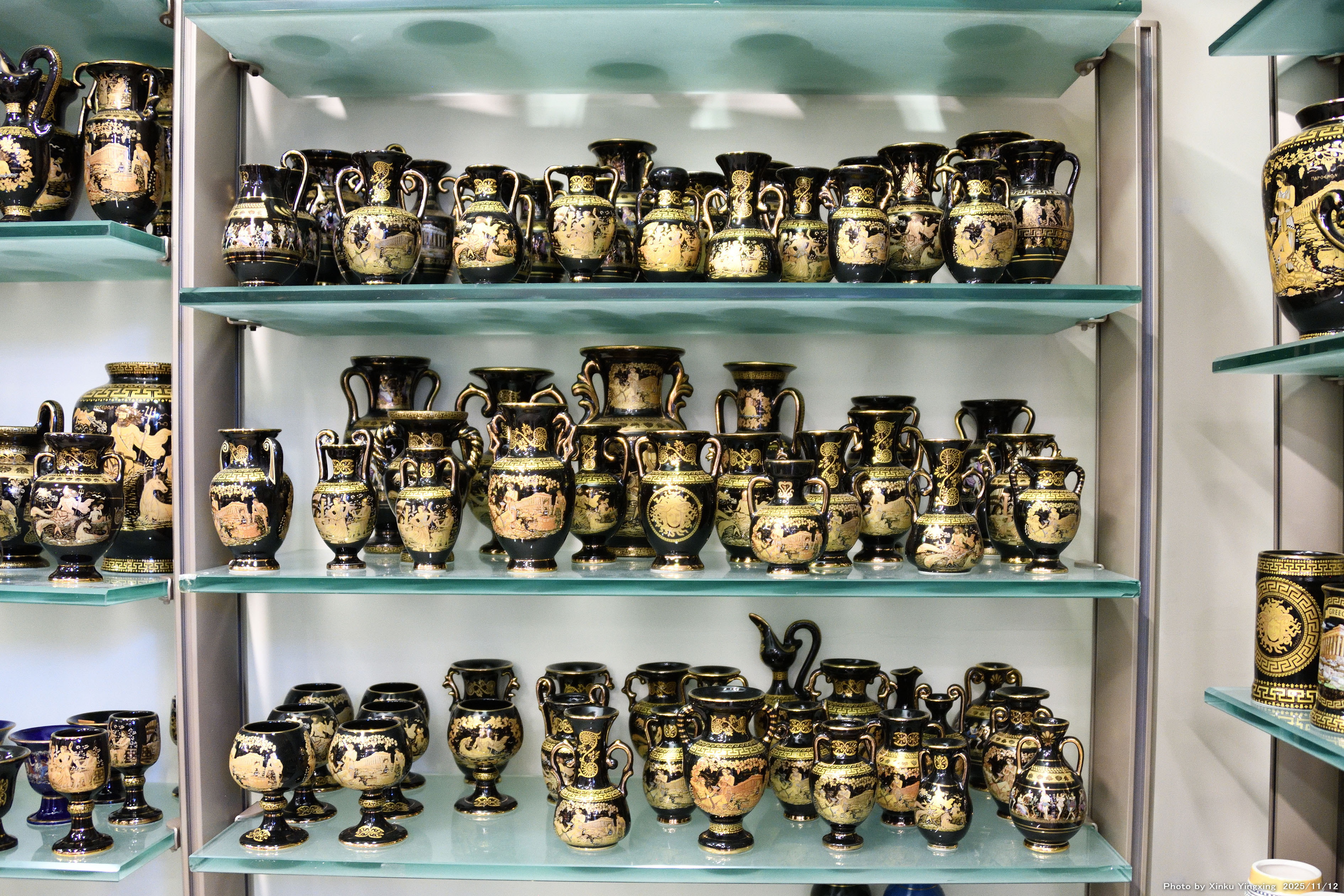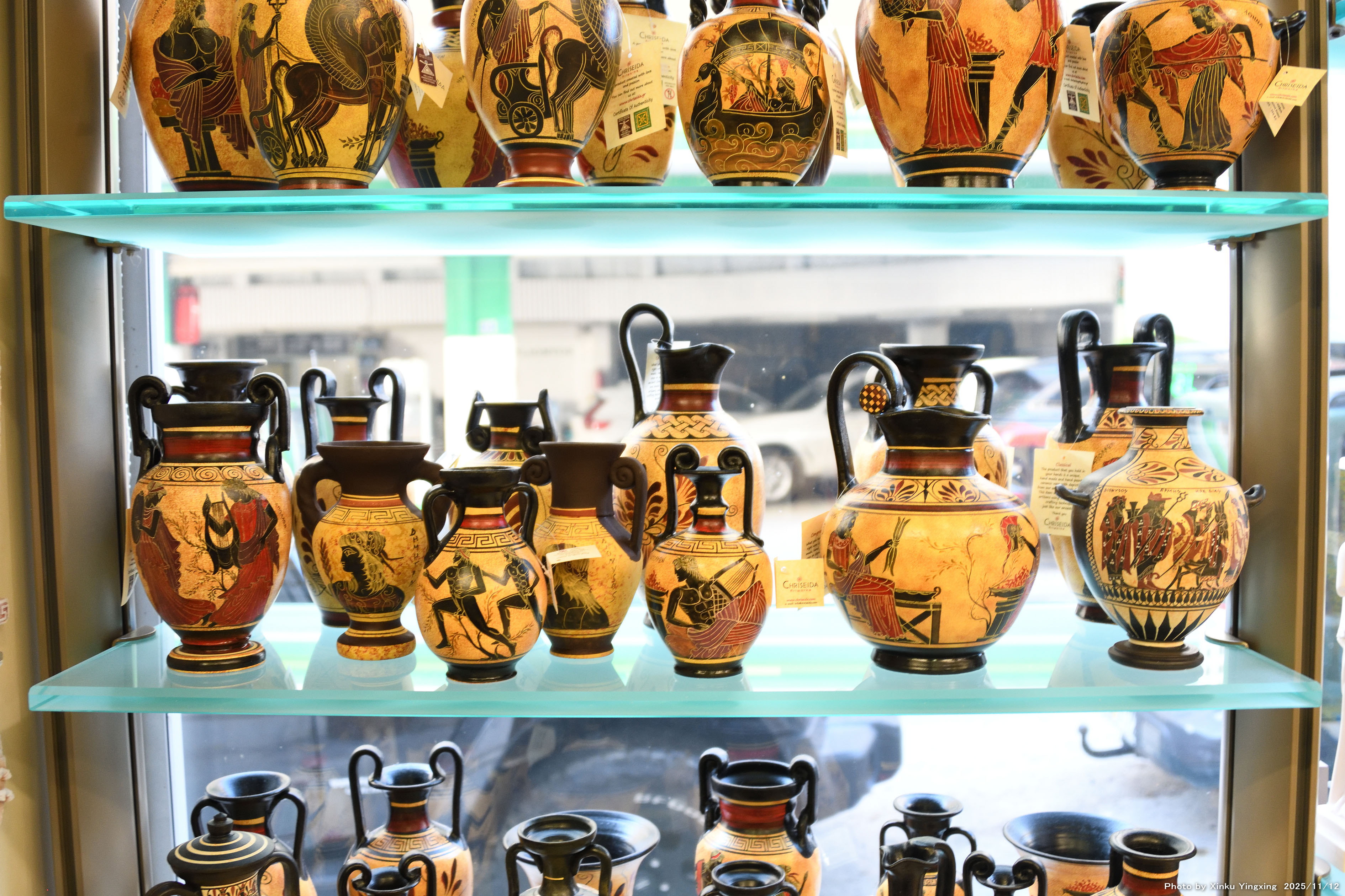 7-10 お土産屋さんHydraにて、お土産品が沢山展示されています。黒像式の古代ギリシア陶器(レプリカ)です。
