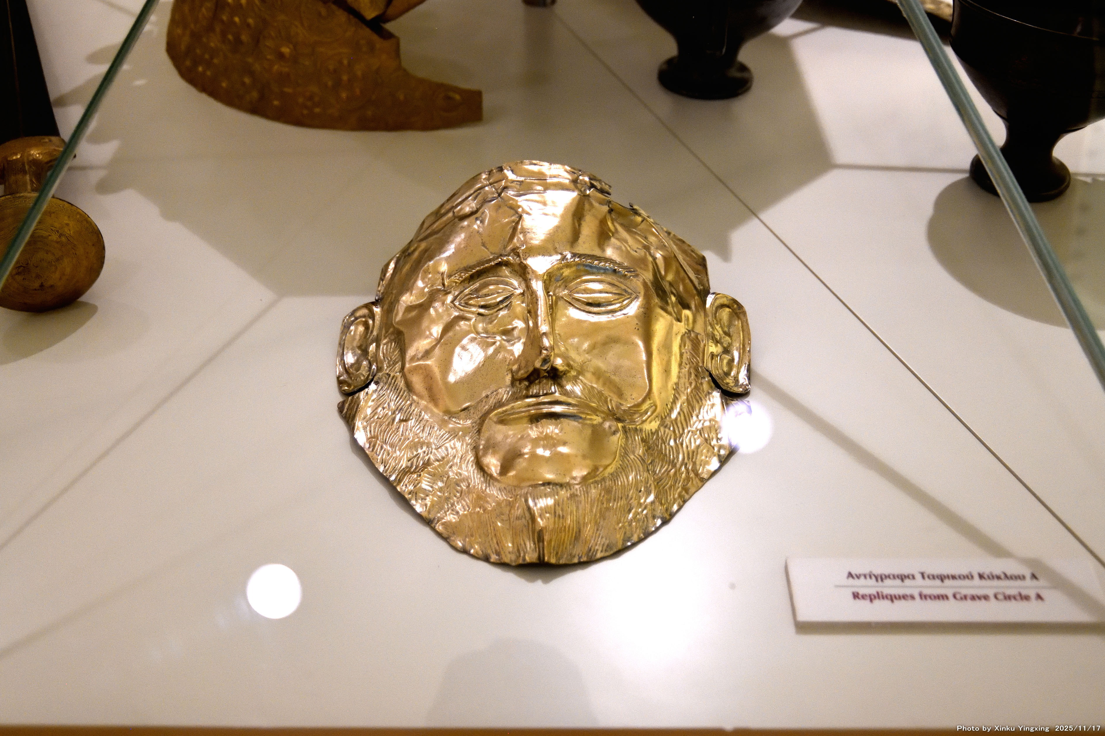 4-11 「(3)環状墓地A」で発見された「アガメムノンの黄金マスク」です。(ミケーネ考古学博物館で撮影)