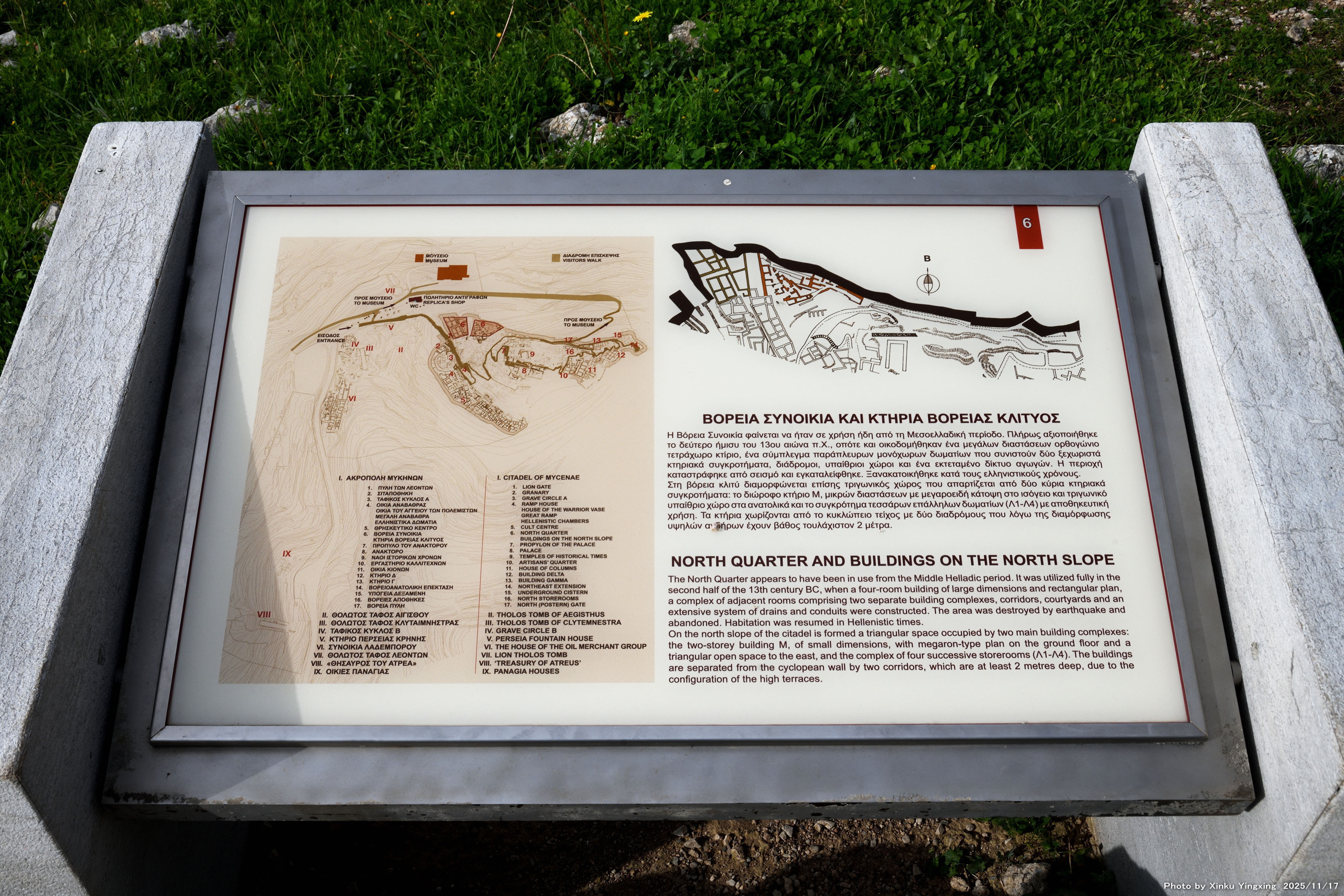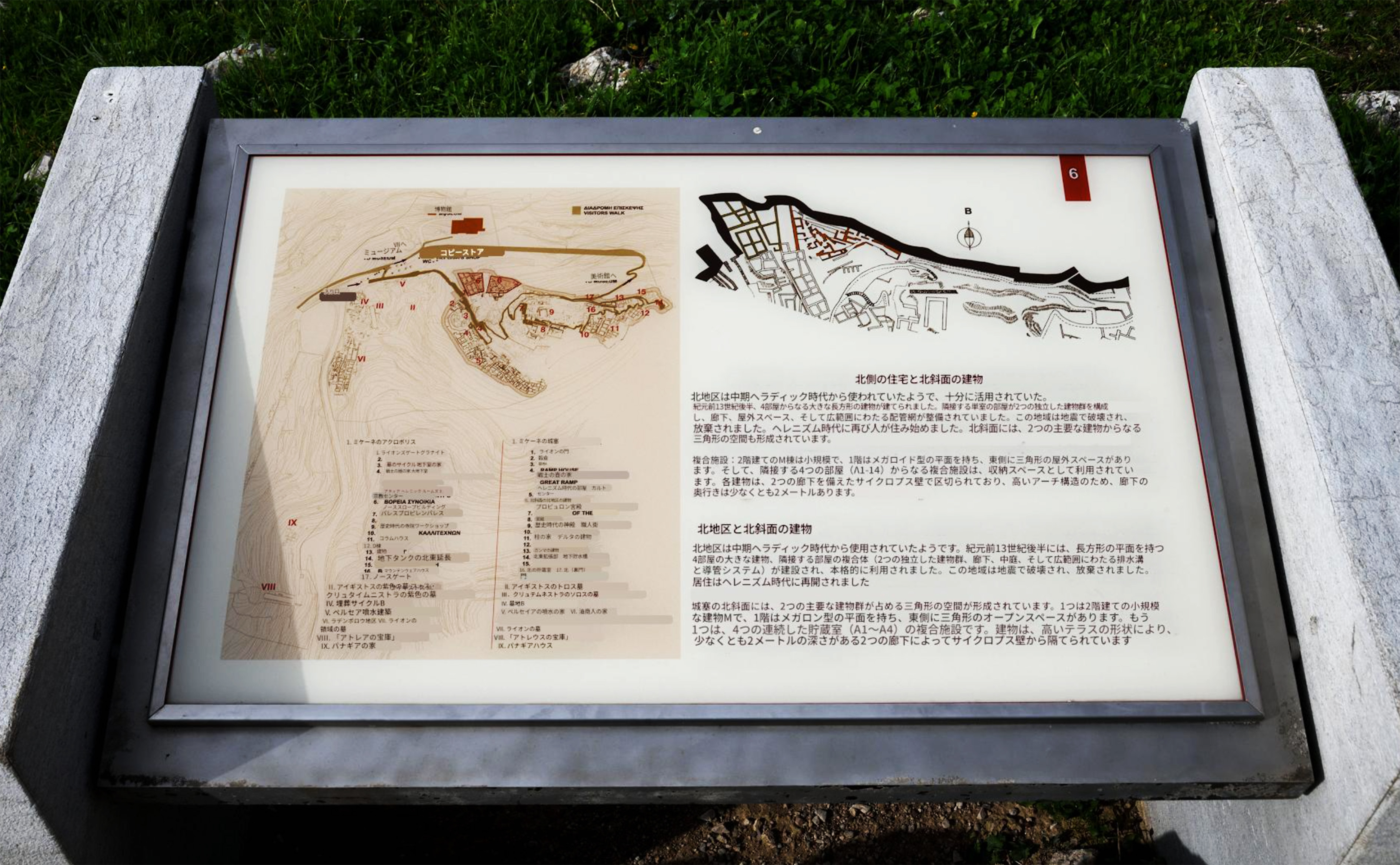 5-9 ミケーネ遺跡(王宮殿)にて、「(6)北地区の住宅・北側斜面の建物」の現地説明板です |