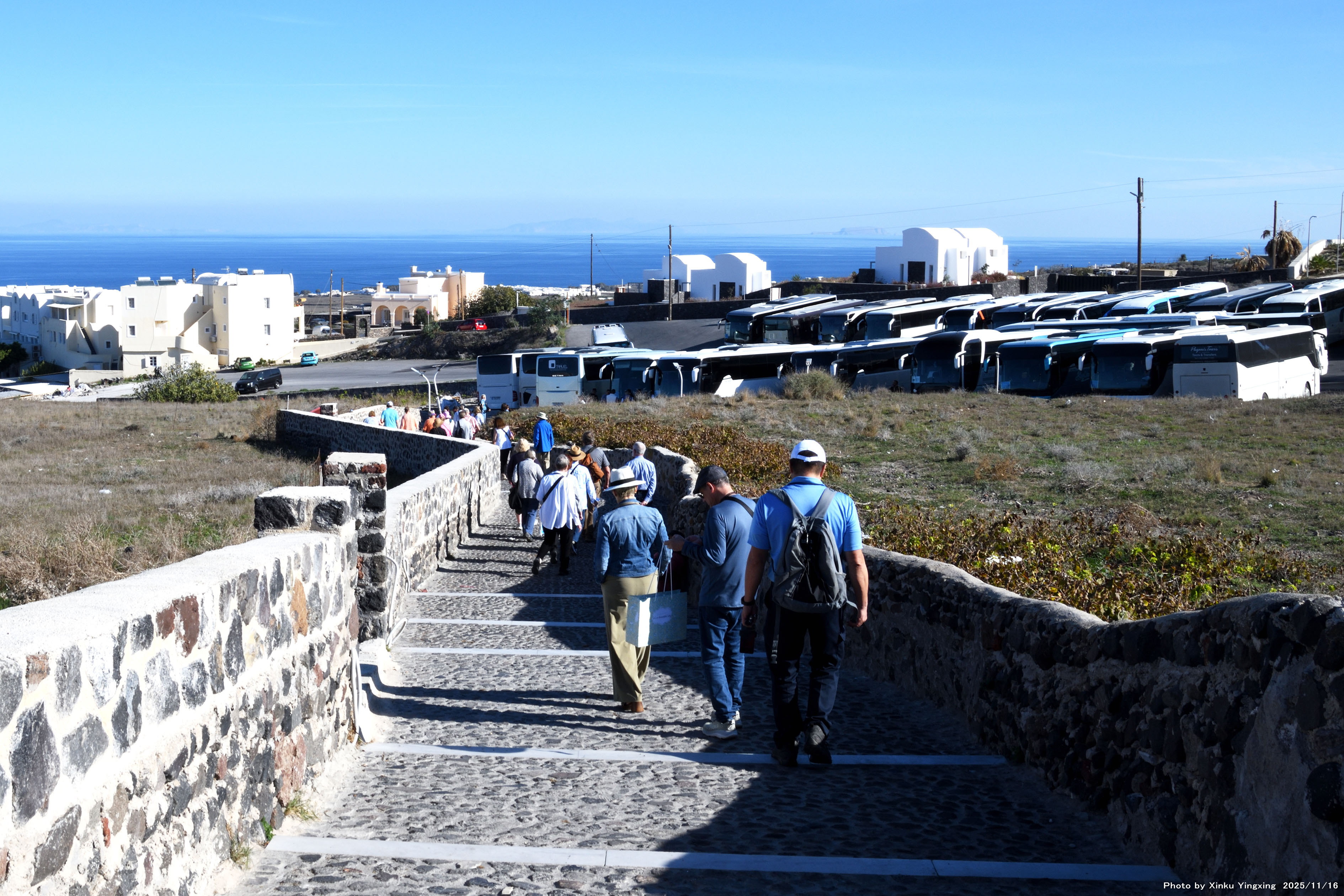1-1 サントリーニ島イアの駐車場にて、沢山のバスが駐車しています。
