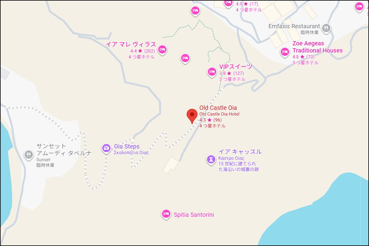 サントリーニ島イアのイア城は、城址としてよりも夕陽の名所として世界的に知られています。15世紀のヴェネツィア時代に建設された城は断崖の海の先端に築かれていて、城址としては石垣と石造りの小さな建物のみとなっていました。石垣は区割りされていましたが、何に利用されていたのか、何も分かりませんでした。説明板でもあれば少しは城としての散策もできますが、城址としてよりも夕陽の名所として整備されているように見えました。