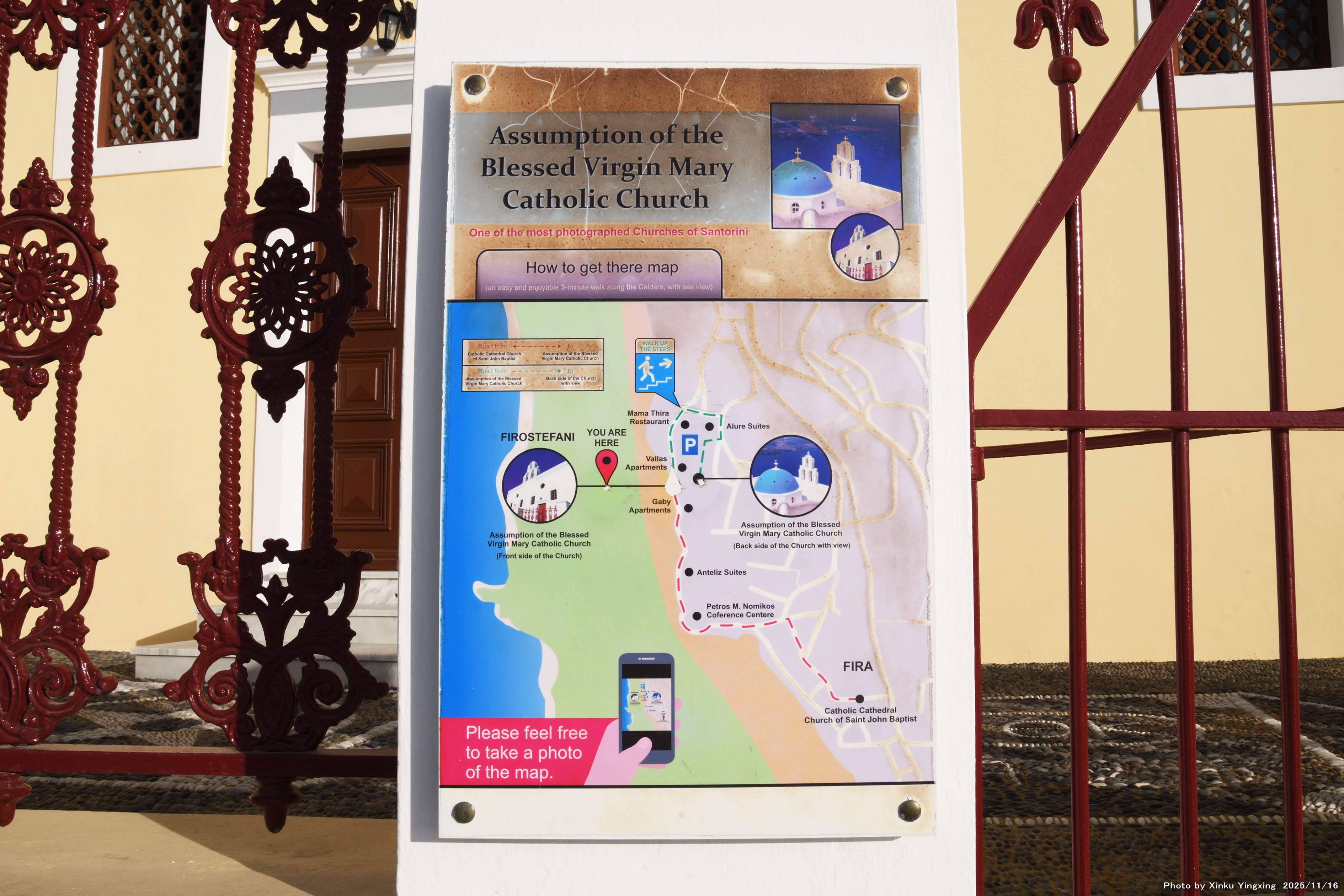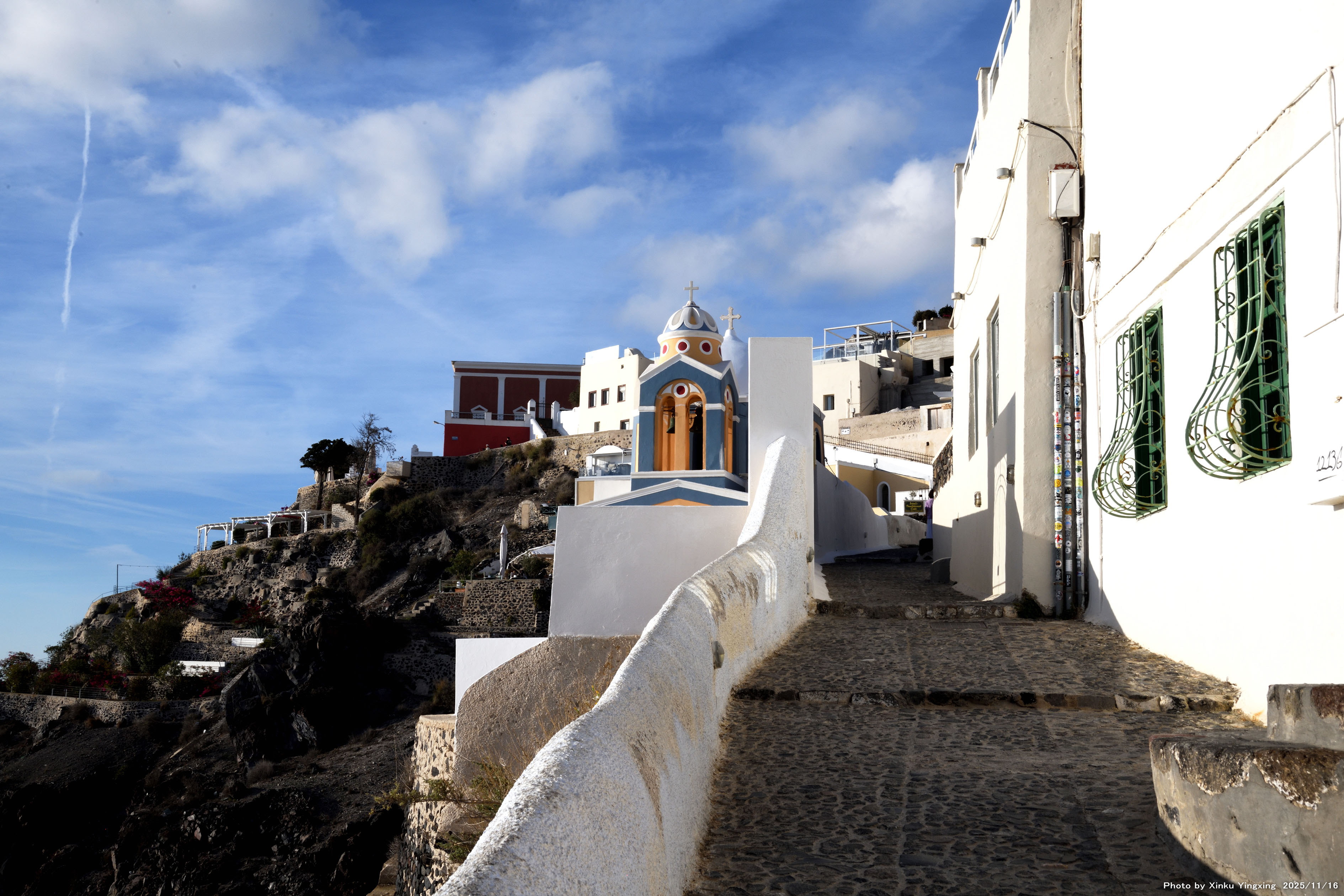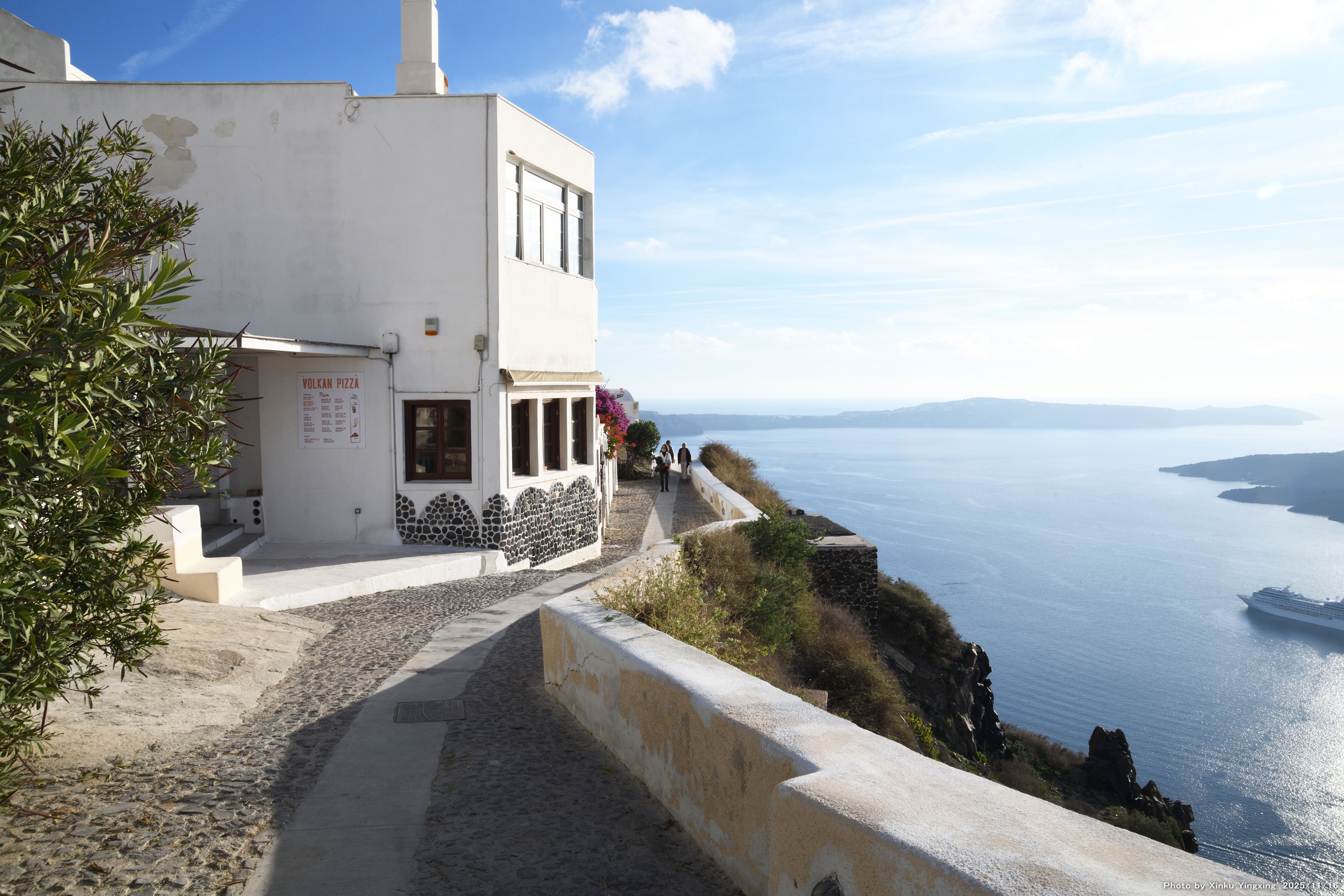 フィラのケーブルカー駅から海沿いの岸壁の上の歩道を景色を楽しみながら進みました。この歩道散策が青い海、青い空、白い建物と絶景の眺めでした。歩道沿いのスリーベルはすぐにわかりましたが、ブルードームの見える場所には道路が工事中のためわかりにくかったが無事到着。到着後何度も動画や写真で見た風景が目の前に広がっていました。時間的に逆光になったのは残念でした。また教会への入り口は閉まっており、中に入ることはできませんでした。観光後、もと来た道を引き返しケーブルカー駅まで引き返しました。
