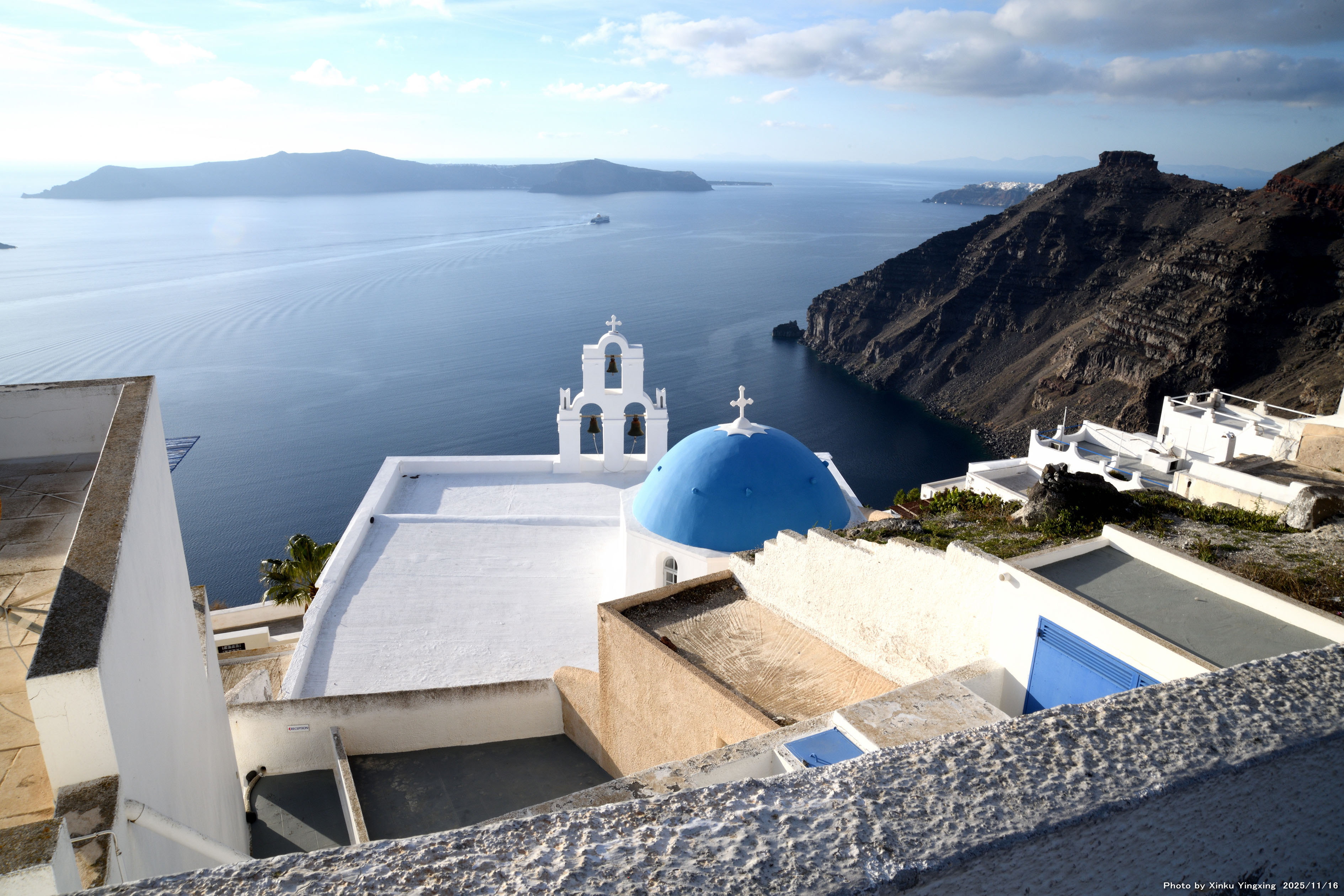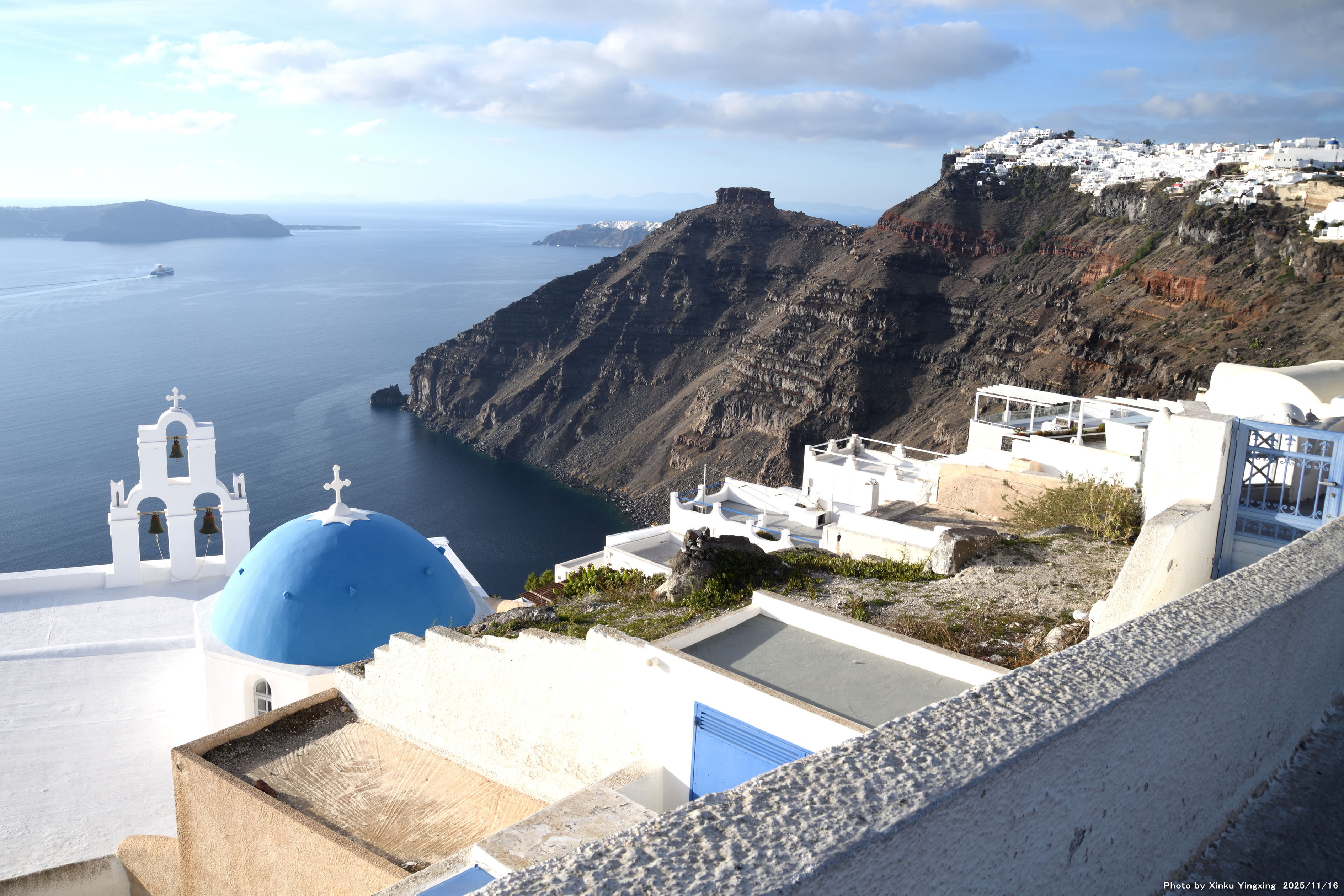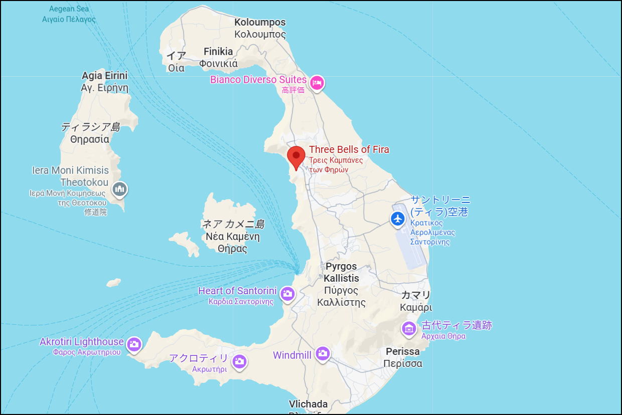 フィラのスリーベルは、フィロステファニ地区にある青いドームと3つの鐘のあるギリシャ教会で、サントリーニ島を代表する景観とのことです。