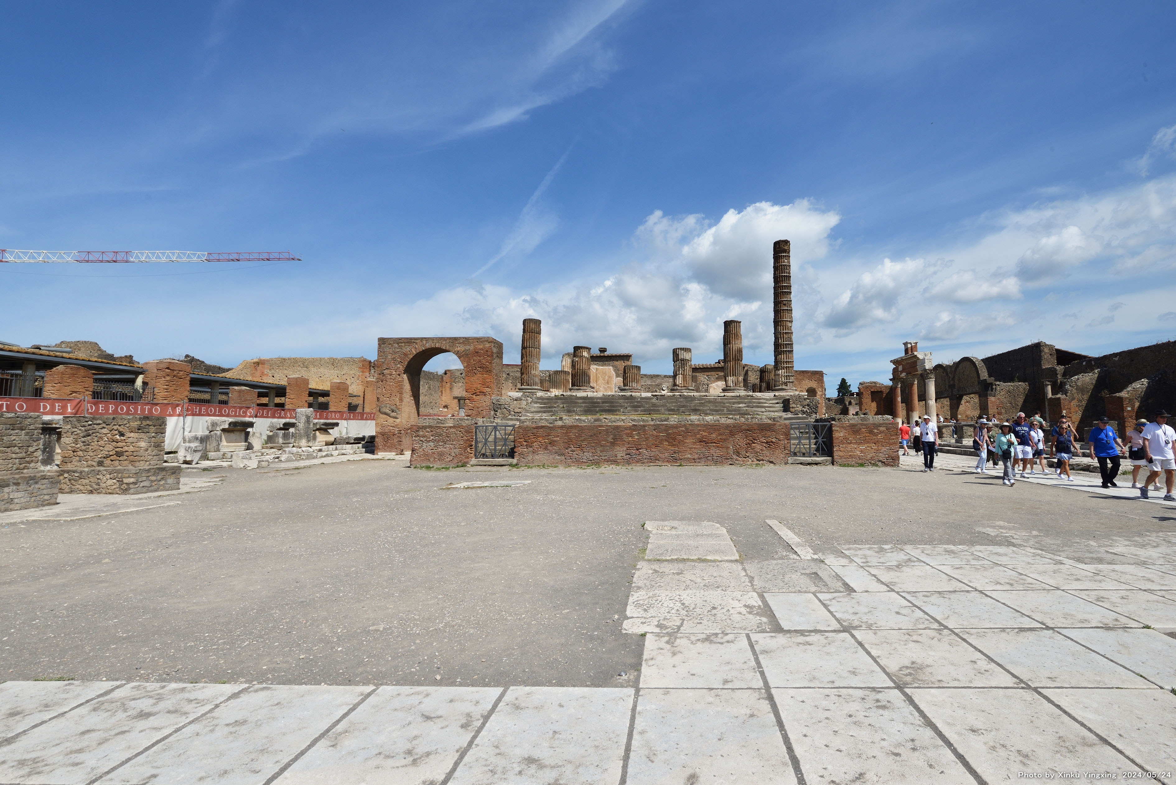 4-2 ポンペイ遺跡、ジュピター神殿を望む。ポンペイで最も重要な神殿だったとのことです。 主神ユピテル(ジュピター)を含む、ジュノー(ユピテルの妻)、ミネルバ(知恵と武勇の神)の三神が祀られています。 |