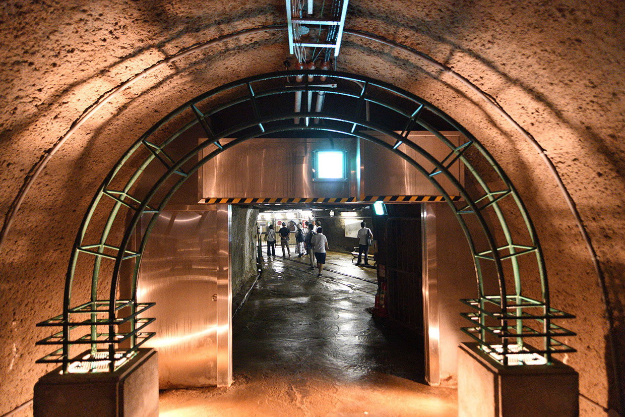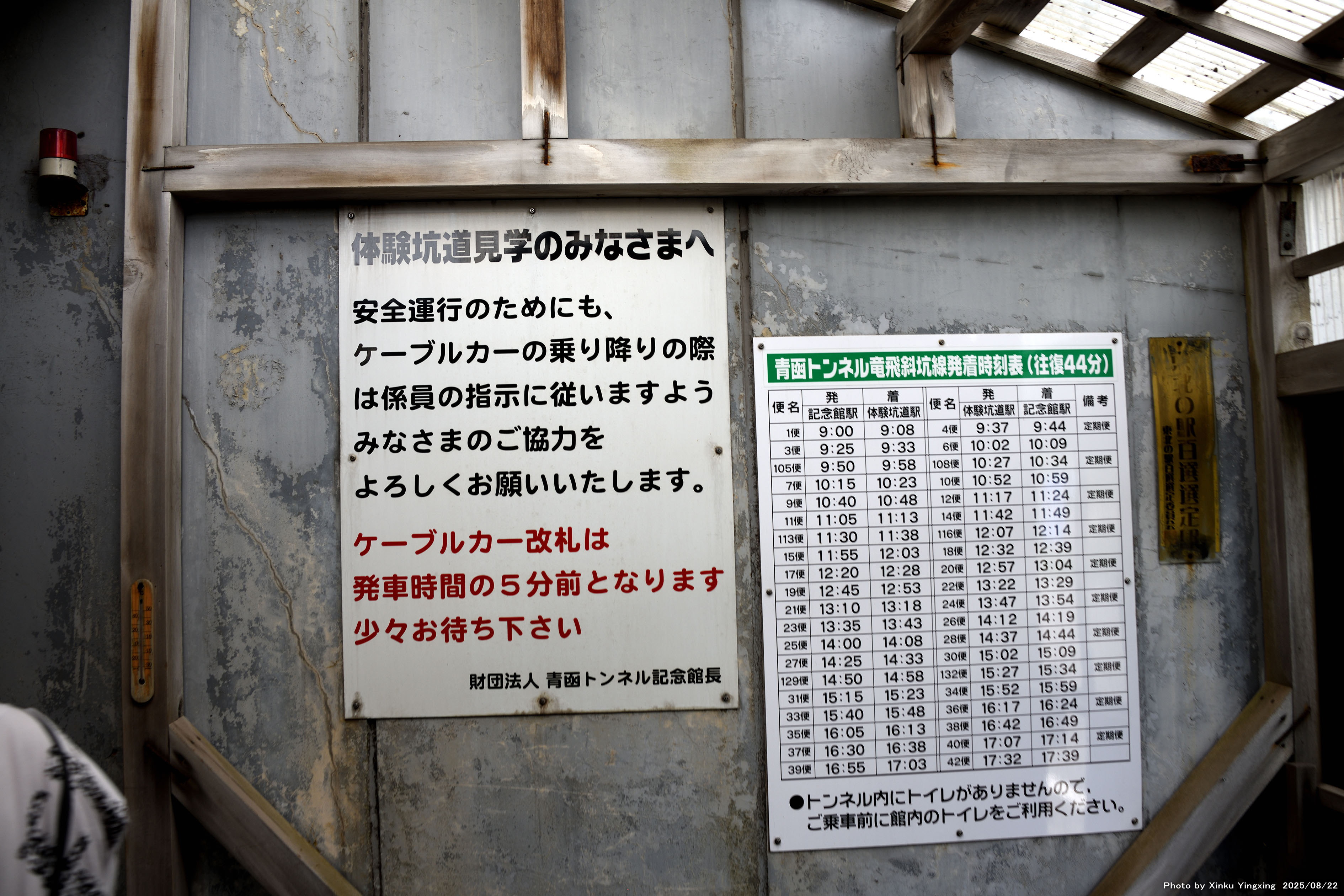 青函トンネル記念館の体験坑道観光は、「青函トンネル竜飛斜坑線”もぐら号”」で青函トンネル記念駅からから海面下140mの体験坑道駅へ、ケーブルカーに乗って行くトンネル見学です。青函トンネル記念駅では地下への重厚な扉が開き、ケーブルカーは急斜度を7分で海面下140mの体験坑道駅に到着します。このケーブルカーには特段鉄道ファンではありませんでしたが、一度は乗ってみたいと思っていました。
