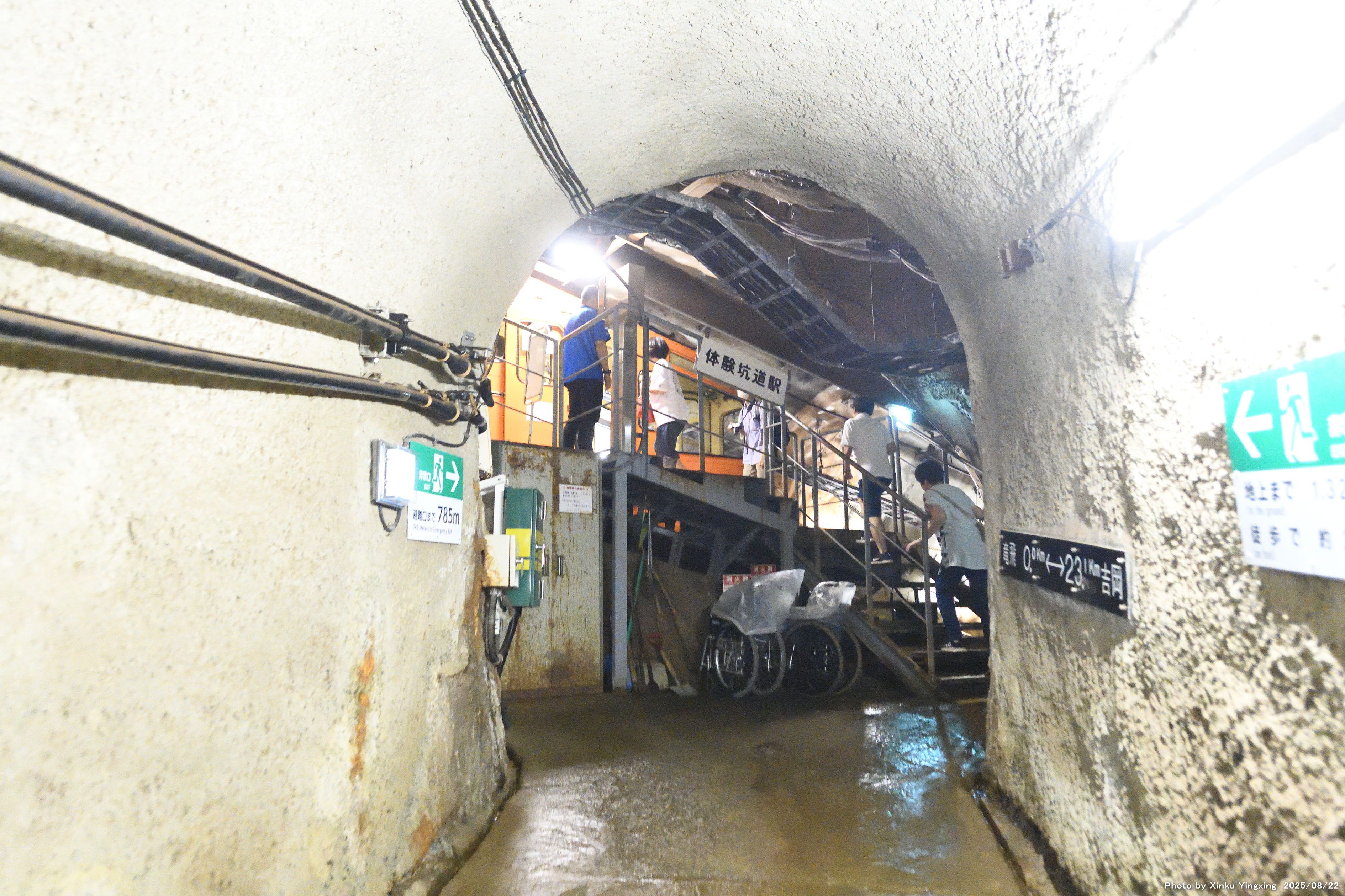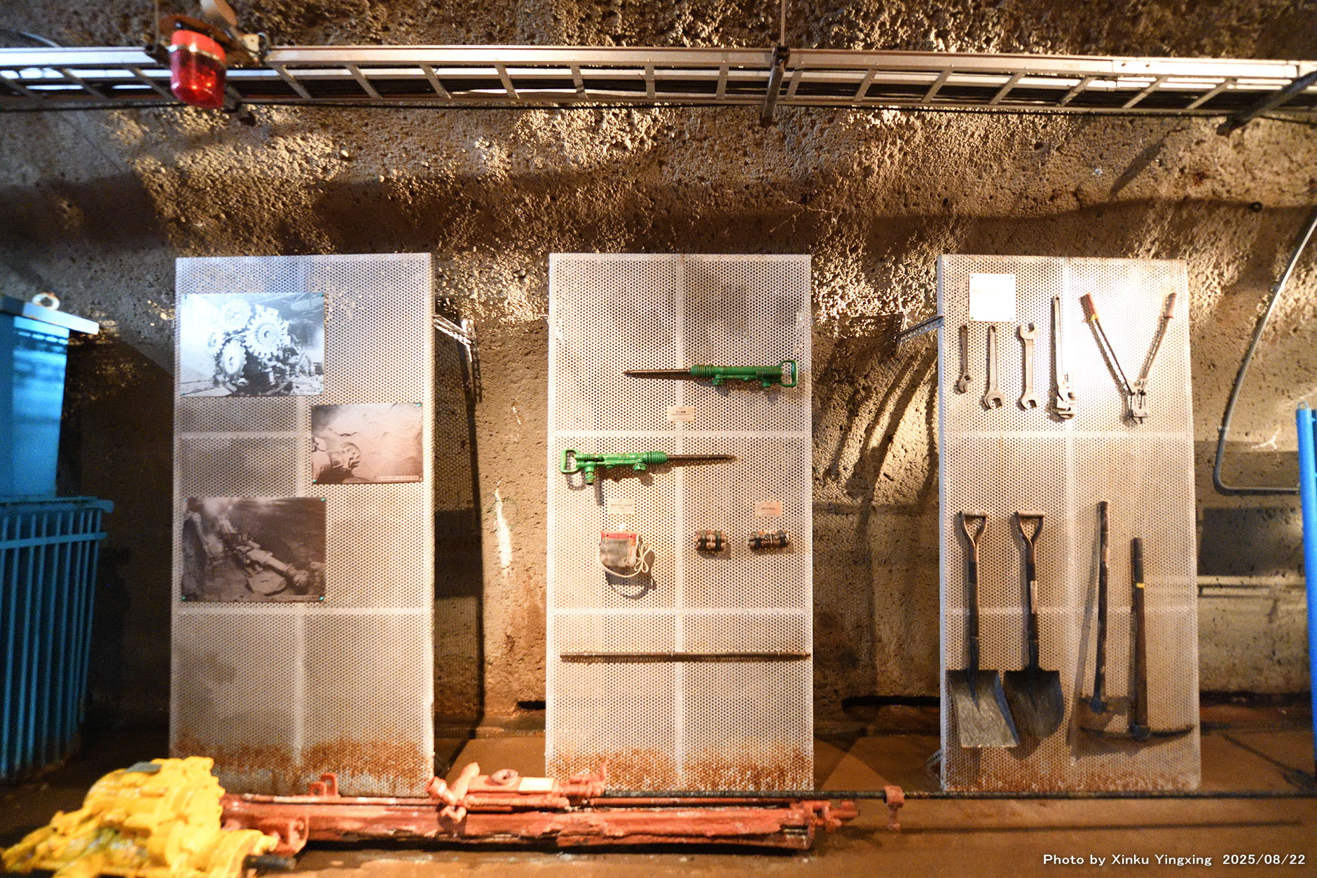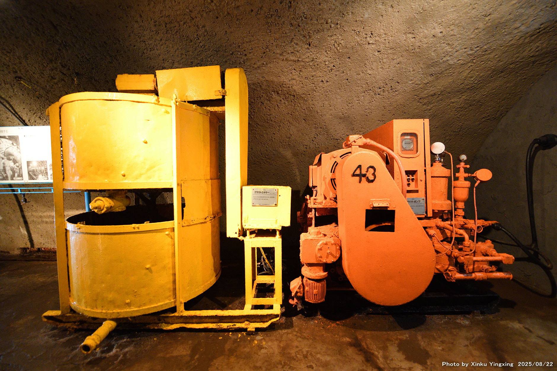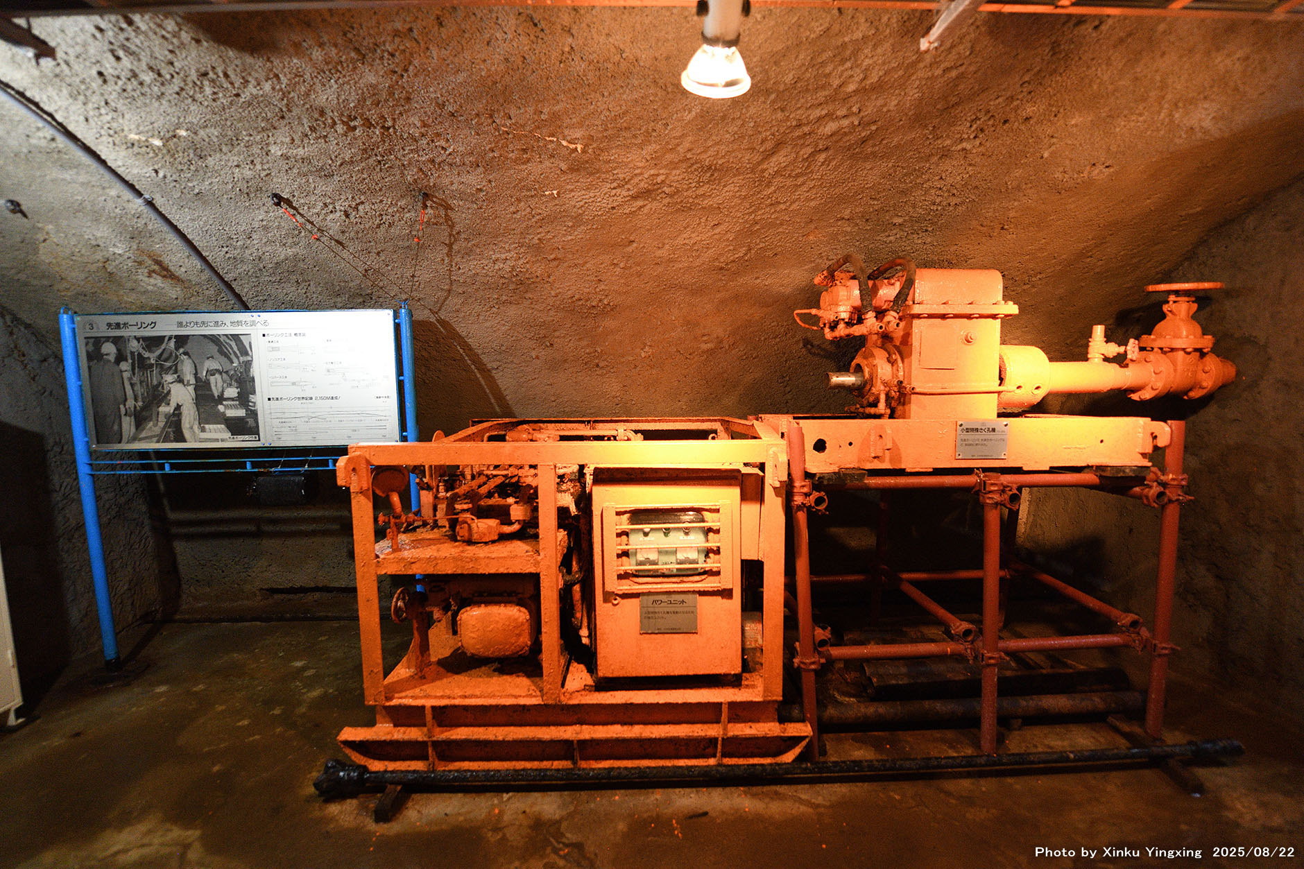 体験坑道駅で坑道を進むと、坑道の一角には、掘削に使われた機械や器具、説明パネルなどで当時の現場が 再現されていました。とても貴重な体験をした観光でした。