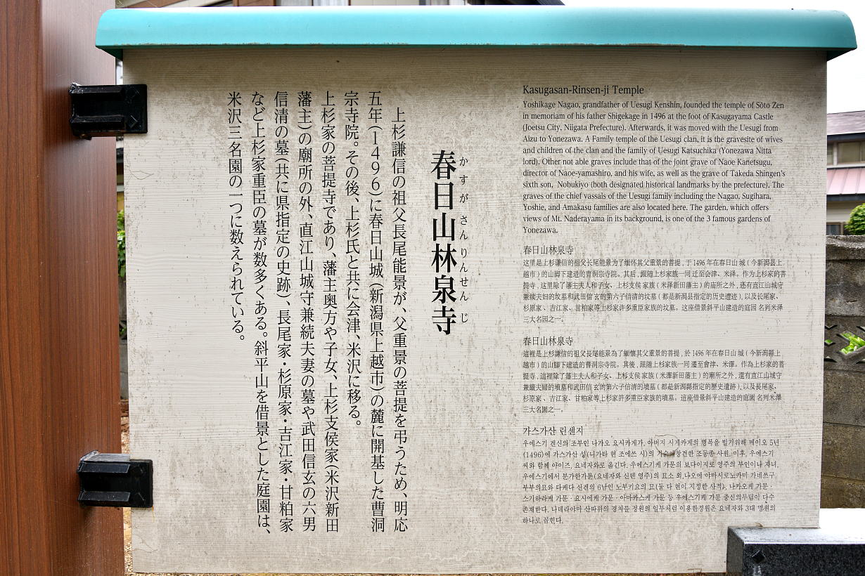 林泉寺(りんせんじ)は、山形県米沢市にある曹洞宗の寺院で、山号は春日山(かすがさん)です。米沢藩上杉家の菩提寺であり、また同藩士直江兼続の菩提寺でもあります。
