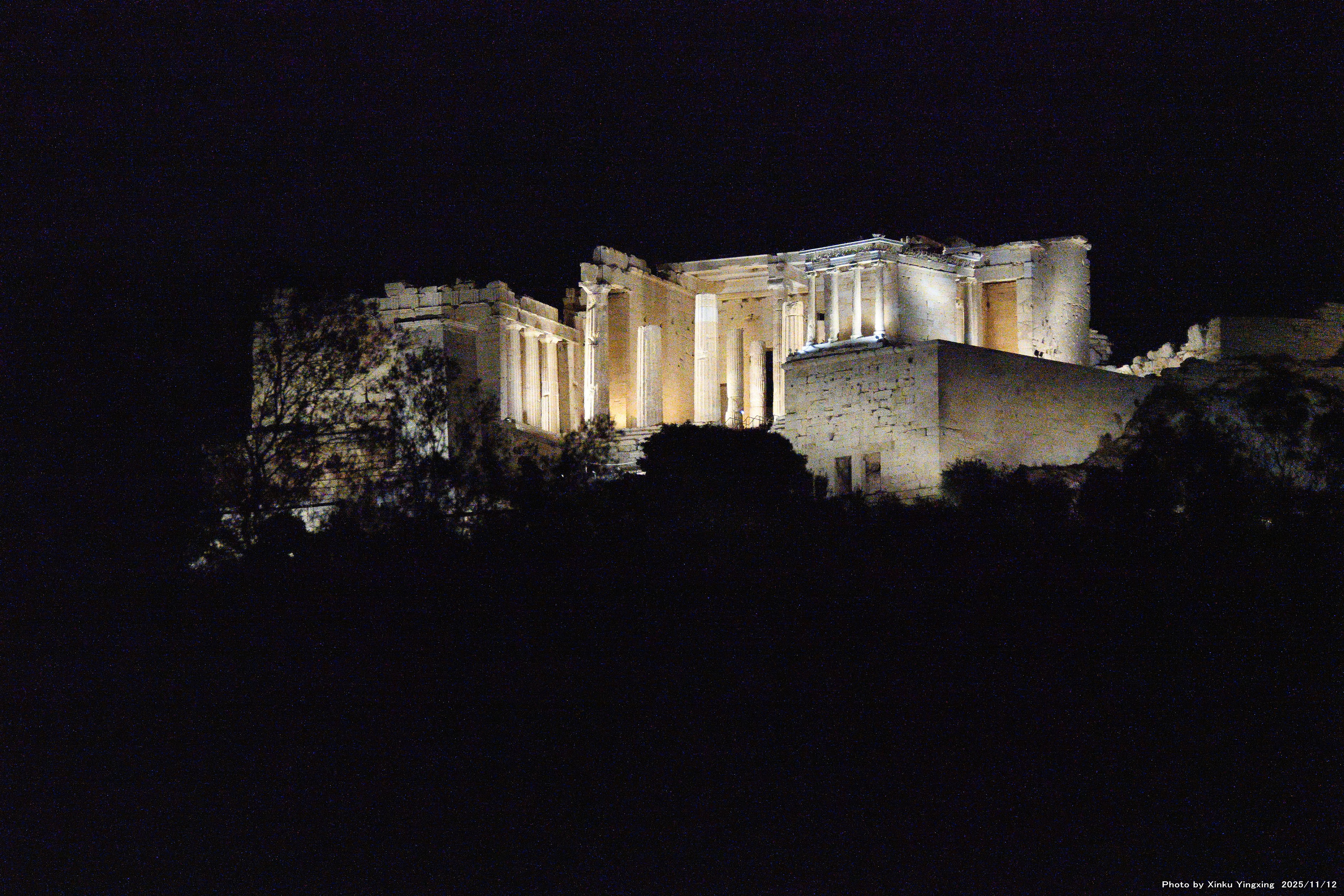 7-6 アクロポリスの丘、プロピュライアのライトアップを望む |