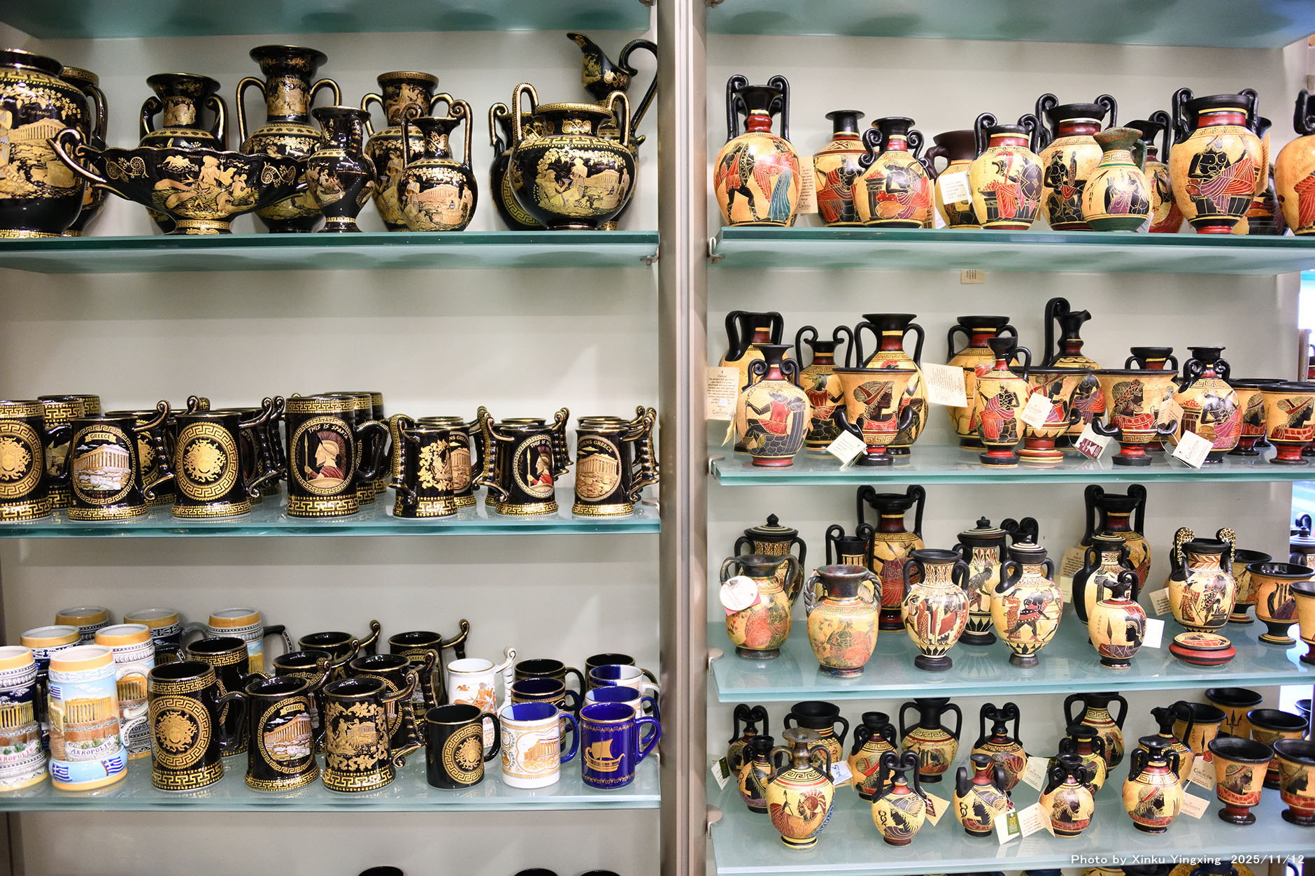 7-10 お土産屋さんHydraにて、お土産品が沢山展示されています。黒像式の古代ギリシア陶器(レプリカ)です。