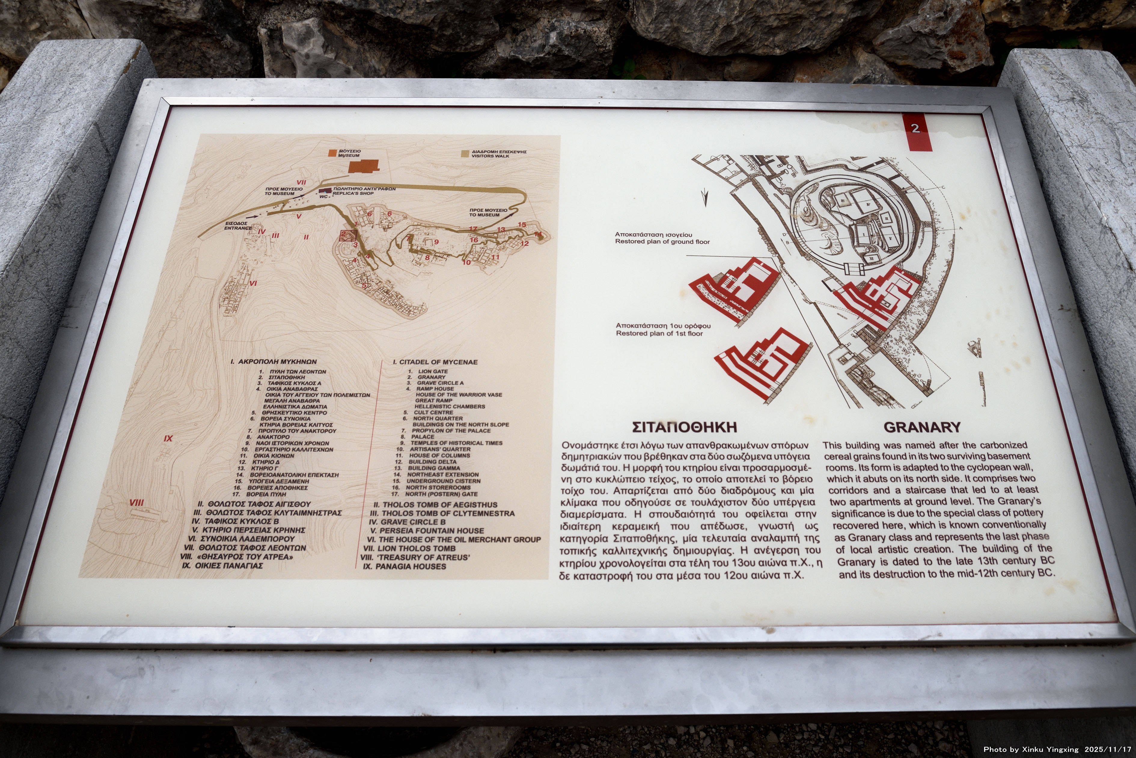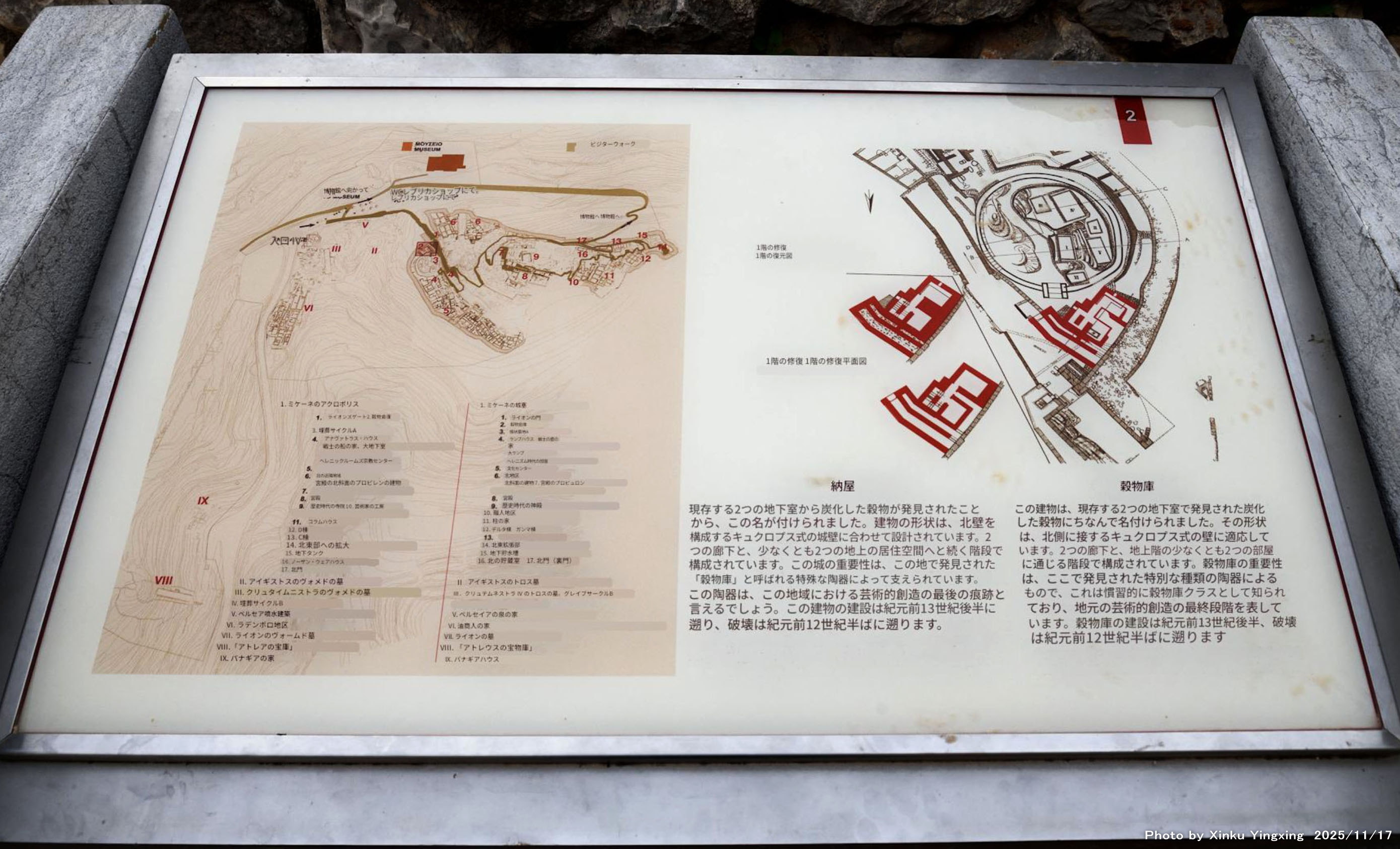 4-2 ミケーネ遺跡(王宮殿)にて、「(2)穀物庫(穀倉)」の現地説明板です |