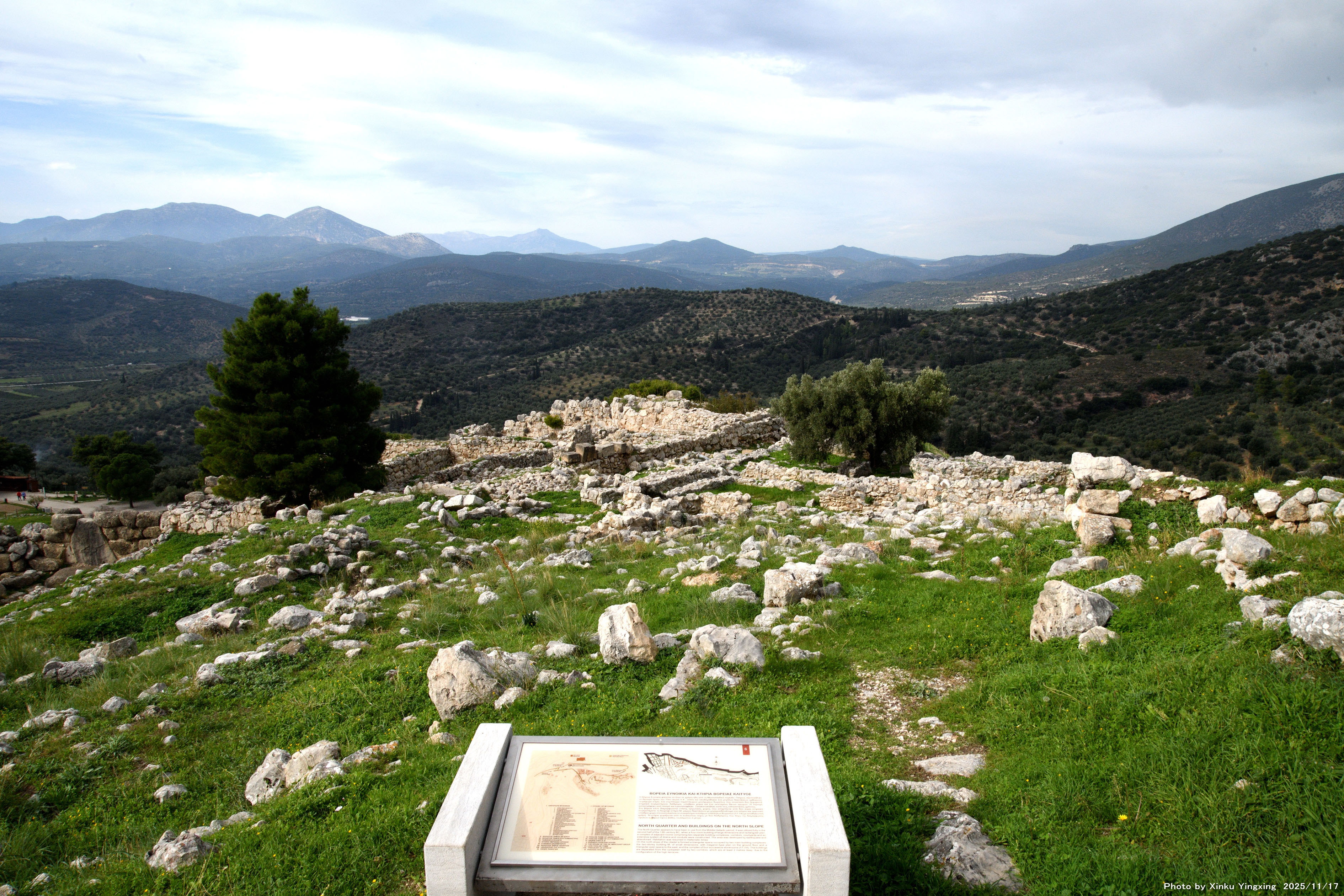 | 5.ミケーネ遺跡 「(4)ヘレニズム時代の部屋・(6)北地区の住宅・北側斜面の建物」を望む |