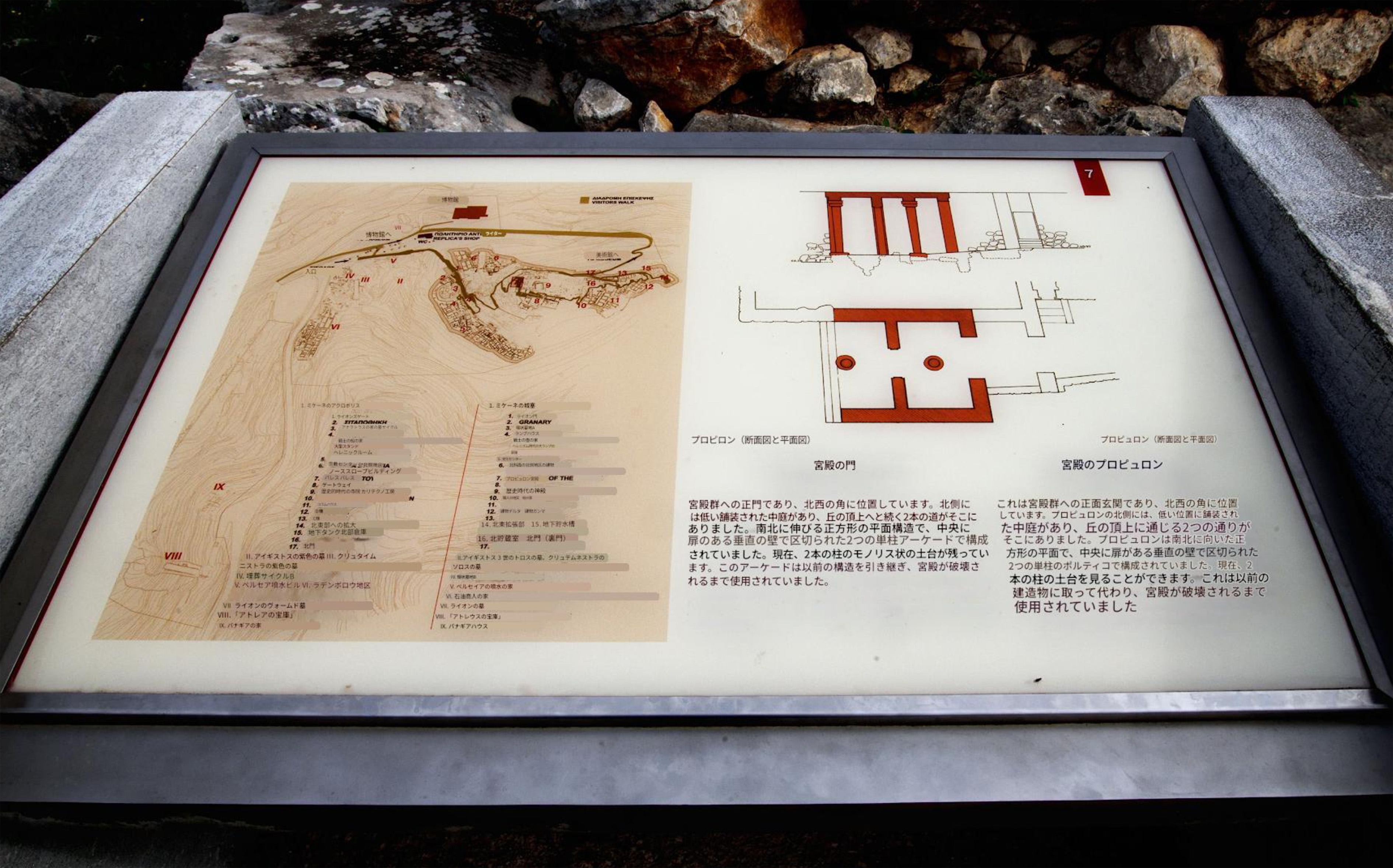 5-9 ミケーネ遺跡(王宮殿)にて、「(6)北地区の住宅・北側斜面の建物」の現地説明板です |