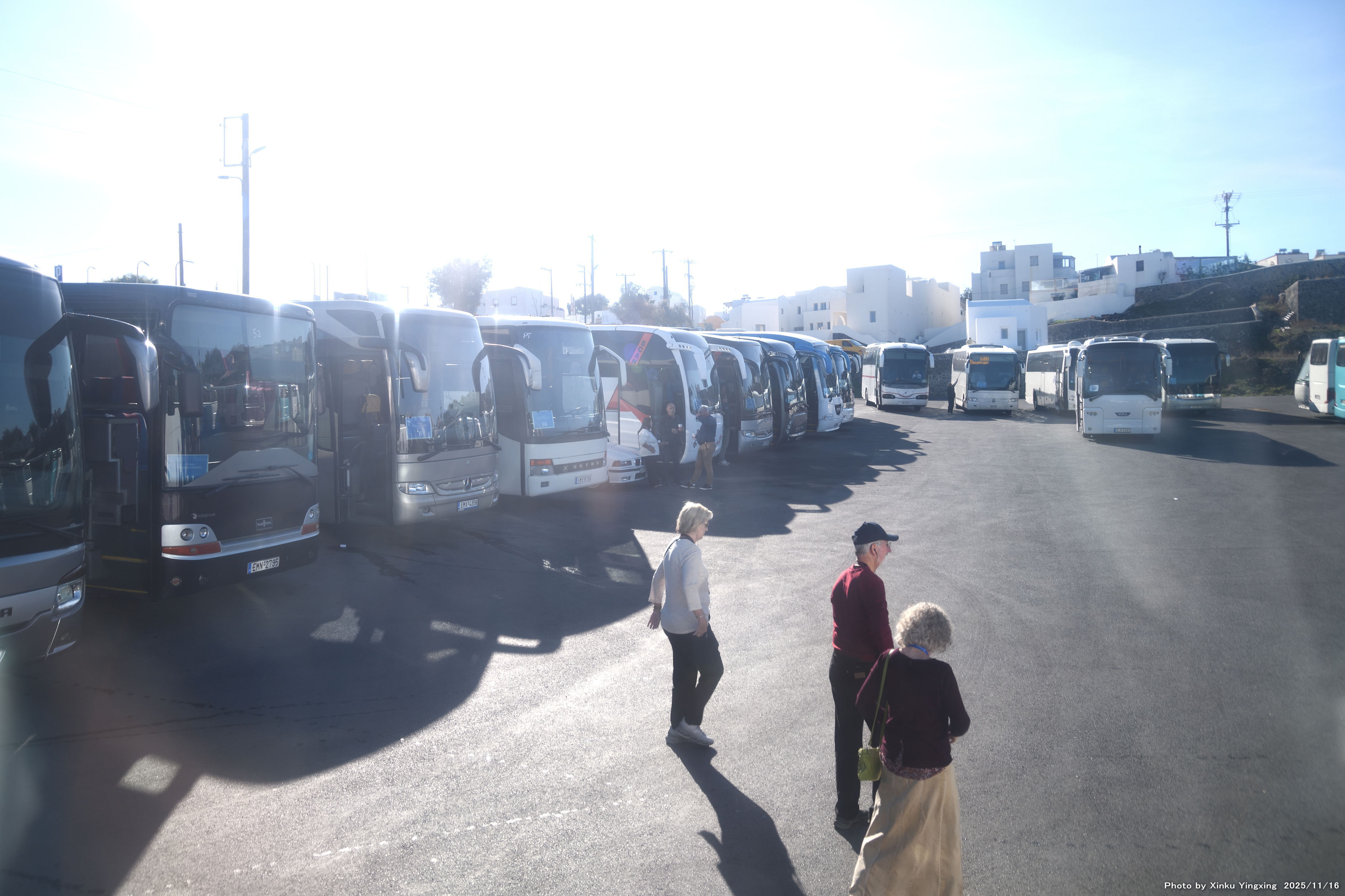 1-1 サントリーニ島イアの駐車場にて、沢山のバスが駐車しています。