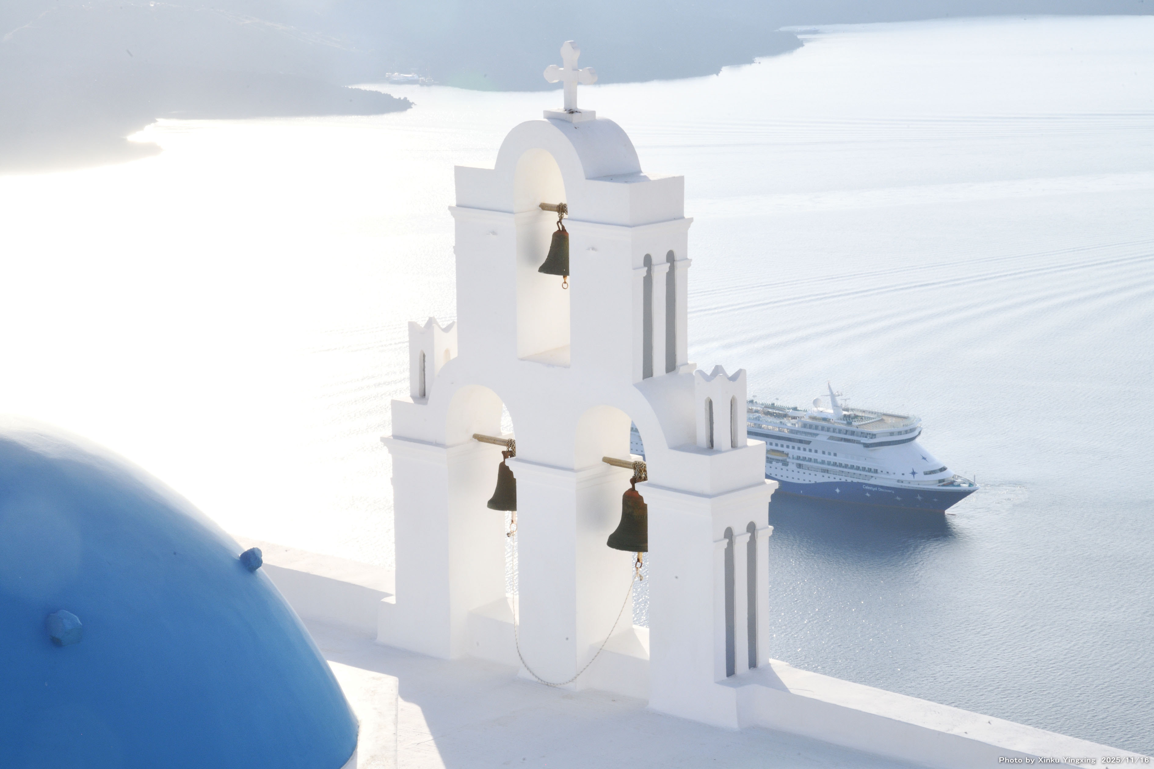 フィラのスリーベルは、フィロステファニ地区にある青いドームと3つの鐘のあるギリシャ教会で、サントリーニ島を代表する景観とのことです。