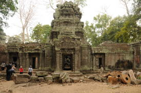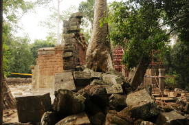 タ・プローム寺院はインド政府が修復計画を発表した(インドはタ・プロームの修復を担当している)。しかし、現在ここで議論が沸き起こっている。熱帯の巨大な樹木は遺跡を破壊しているのか、それともいまや遺跡を支えているのかという議論である。一般に遺跡の修復というものは、崩れている石材を積みなおし、失われた部材は補充してかつての姿を取り戻すために、作業計画を立案する。しかし、タ・プロームから巨木を切り払い、崩れている石材を元に戻した場合、この遺跡の魅力はなくなってしまうのではないのだろうか。だがこのままほうっておけば、遺跡は跡形もなく崩れ去ってしまうかもしれない・・・・・。 (ウィキペディアより) |