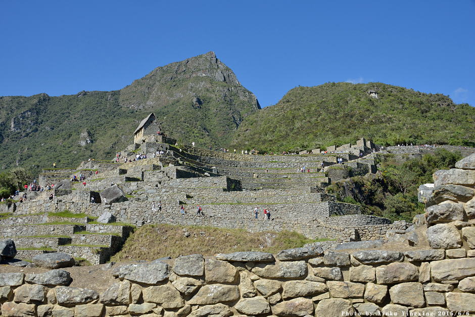 マチュピチュ遺跡、インティワタナ(日時計)を望む。インティワタナは最上部にあります。中央部の石垣は”主神殿”です |
